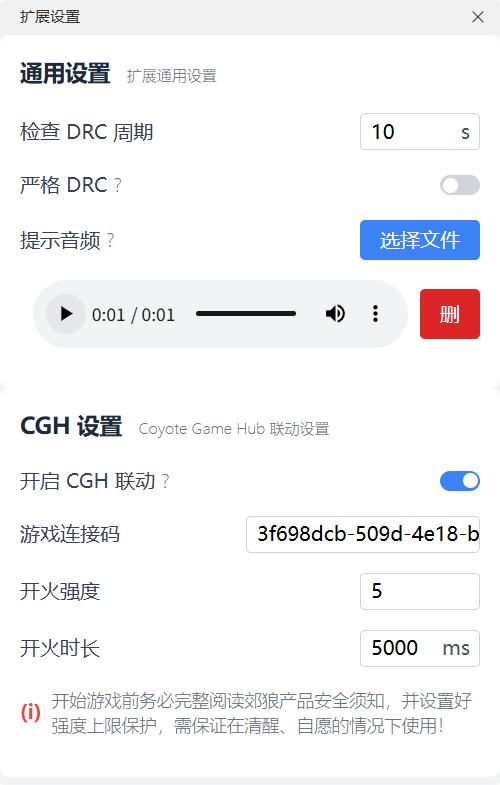 本 DEA 扩展将周期性检查 DRC,若出现 DRC 错误,可播放自定义语音,若填写 CGH 游戏链接码,可以与郊狼联动实现战败惩罚